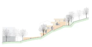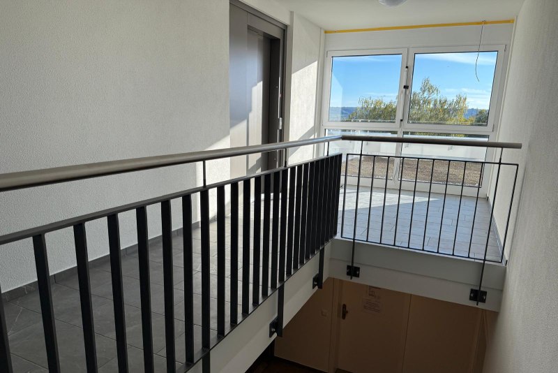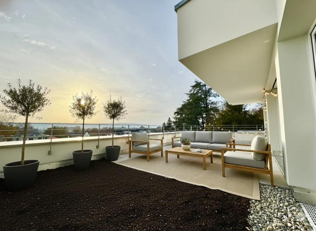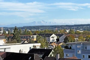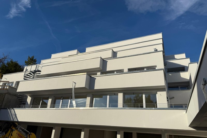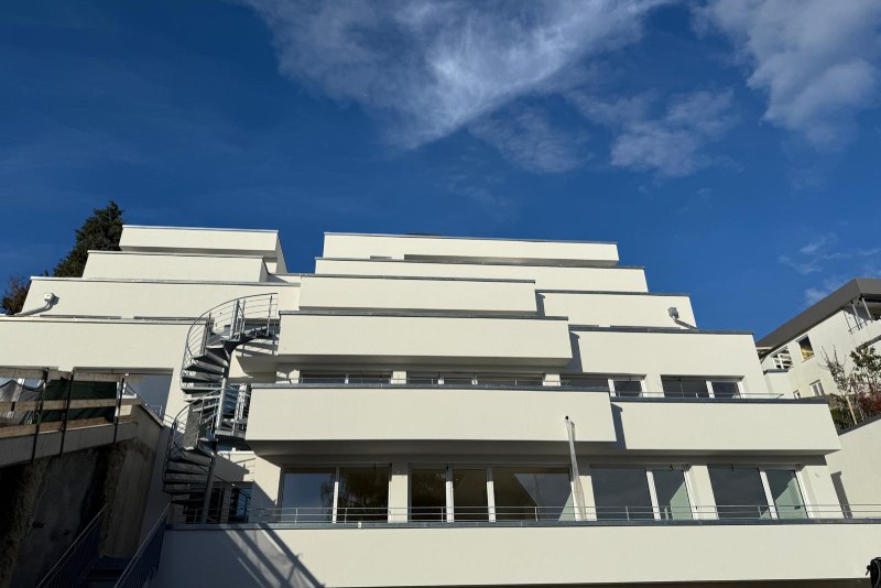 Eine harmonische Einbindung in die Umgebung ist uns besonders wichtig. Zum Erstbezug wird das Gebäude noch am Anfang seiner visuellen Entfaltung stehen: Schon bald wird wilder Wein den urbanen Steinelementen Leben einhauchen, begrünte Dachflächen werden den Wohnkörper natürlich kühlen, und die großzügigen Terrassen laden zur individuellen Gestaltung und Begrünung durch die Bewohnenden ein. Die Führung des Gebäudes entlang der Hanglage sorgt für angenehm kühle, ruhige und trotzdem helle Innenräume – und gleichzeitig für weite, teils spektakuläre Ausblicke bis hin zum Bodensee und zum Konstanzer Münster.