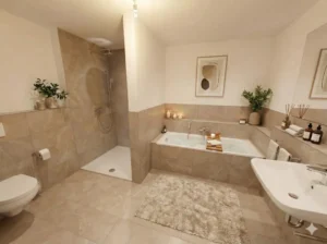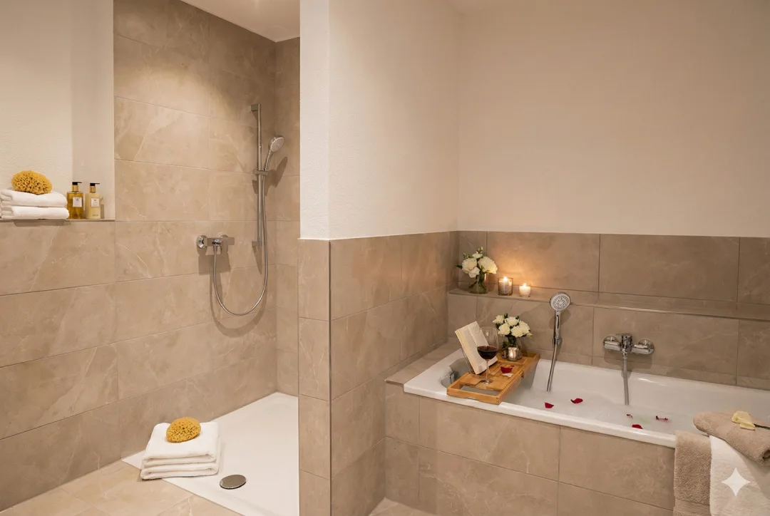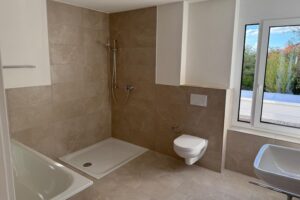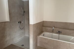 Bodengleiche Dusche, in größeren Wohnungen zusätzlich Badewanne